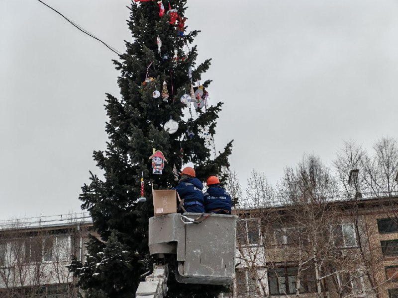 Развешать гирлянды и украшения помогли специалисты МЖФ, елку они наряжали почти три часа.