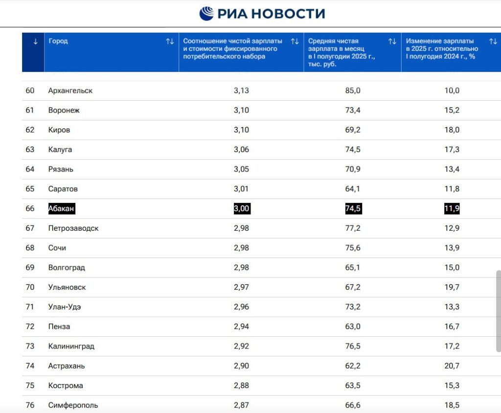 Соотношение зарплаты и стоимости фиксированного набора в Абакане составило 3,00