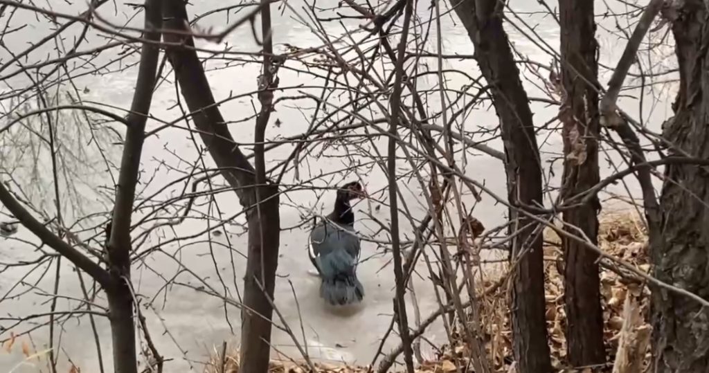 Дрена частично замерзла, но есть промоины, поэтому она то плавает, то передвигается по льду и достаточно хорошо перелетает с места на место на большие расстояния.