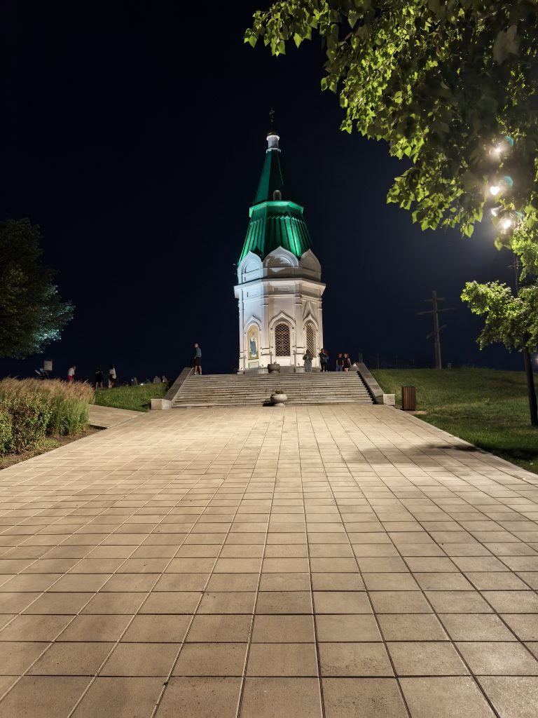 Смотровая площадка, где располагается часовня, находится на улице Степана Разина, 51. На личном авто добираться удобнее, на автобусе будет чуть сложнее, а в конце придется немного прогуляться пешком от улицы Каховской. Мы поднялись до смотровой уже за полночь, но на парковке было очень много машин, люди гуляли по площадке, несмотря на столь позднее время, кафе и закусочные были полны посетителей. Какой же красивый вид открывается с этой смотровой площадки! Гуляя по аллее до самой часовни, можно любоваться панорамой сияющего огнями большого города. Здесь были и влюбленные парочки, и подростки, отмечающие день рождения, и серьезные взрослые…