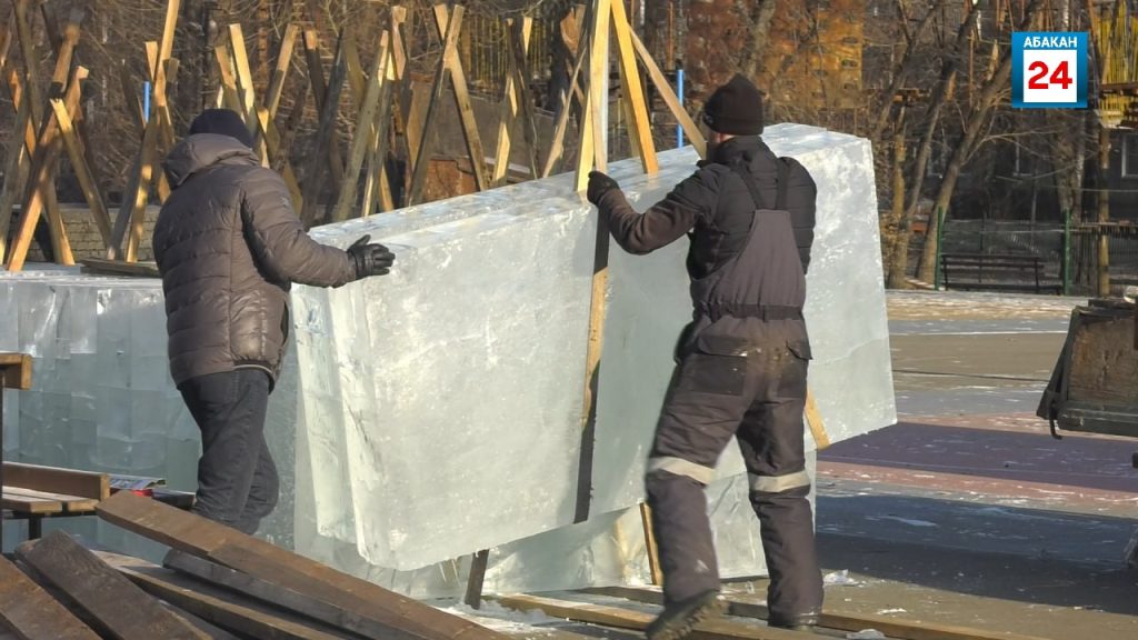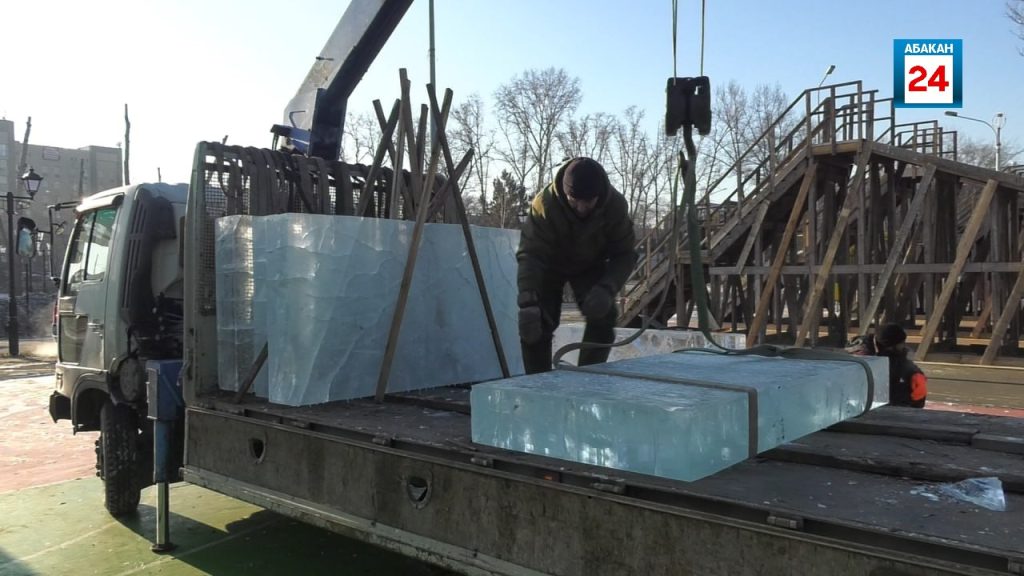 Параллельно в парке идёт монтаж и ледяных горок. Холодный стройматериал уже доставляется. Часть везут с Калининского карьера, также пилят лёд и на реке Абакан.