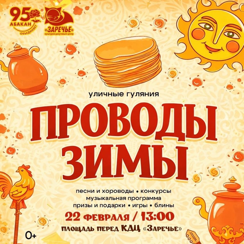 В 12.00 на площади у КДЦ «Красный Абакан» горожан ждёт театрализованное представление, игры, ярмарка мастеров, конкурс на самые вкусные и необычные блинчики, мужицкие забавы, а в финале — сжигание чучела Масленицы.