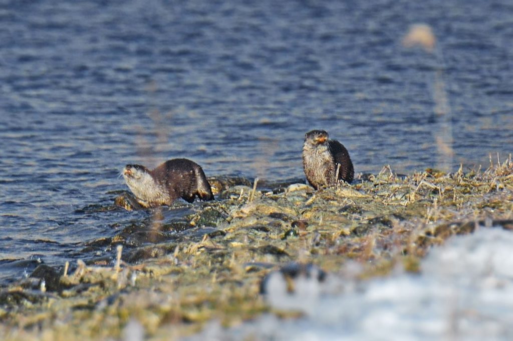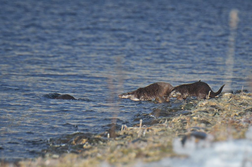 Семейство выдр застали за зимней рыбалкой неподалёку от Майнской ГЭС
